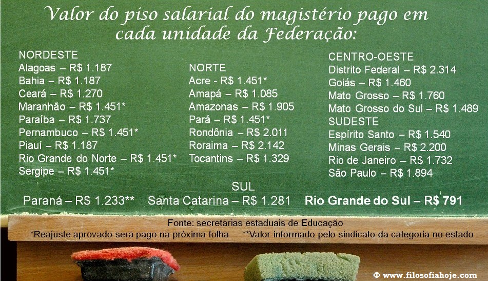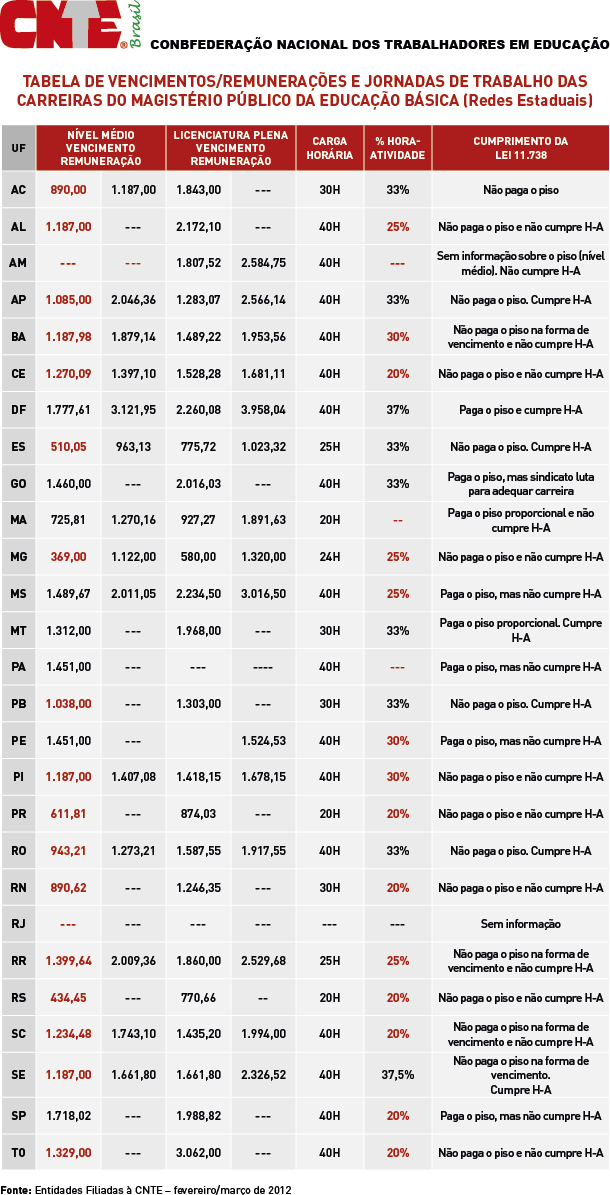 3. A equivalência do piso à Lei 11.738, nesta tabela, considera o valor anunciado pelo MEC para 2012 (R$ 1.451,00). Para a CNTE, neste ano, o piso é de R$ 1.937,26, pois a Confederação considera (i) a atualização monetária em 2009 (primeiro ano de vigência efetiva da norma federal), (ii) a aplicação prospectiva do percentual de reajuste do Fundeb ao Piso (relação ano a ano); e (iii) a incidência de 60% para pagamento dos salários dos educadores, decorrente das complementações da União feitas através das MPs nº 484/2010 e 485/2010.
