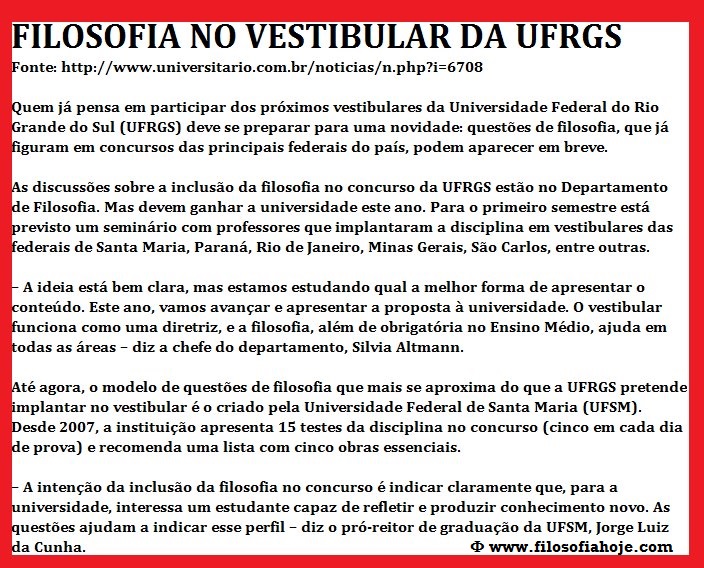Acho normal que a filosofia faça parte dos principais vestibulares das principais universidades do país, afinal desde 2008 é uma disciplina obrigatória em todas as escolas de ensino médio do Brasil. Porém o vestibular é uma ferramenta antiquada, objetiva e diretiva. Acho que é uma ferramenta injusta e imprecisa para medir "o conhecimento filosófico" de alguém. Ao contrario de outras matérias que tem seu valor em suas formulas (matemática, física, etc.), ou das que tem seu valor na relevância histórico-social (história, geografia, etc.), a filosofia tem seu valor maior no ato de filosofar. Tenho o receio que com isso a filosofia na escola se foque em conhecer e decorar conceitos e teorias, ao invés de dar subsídios para que os alunos criem seus próprios conceitos e teorias.
