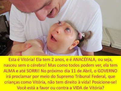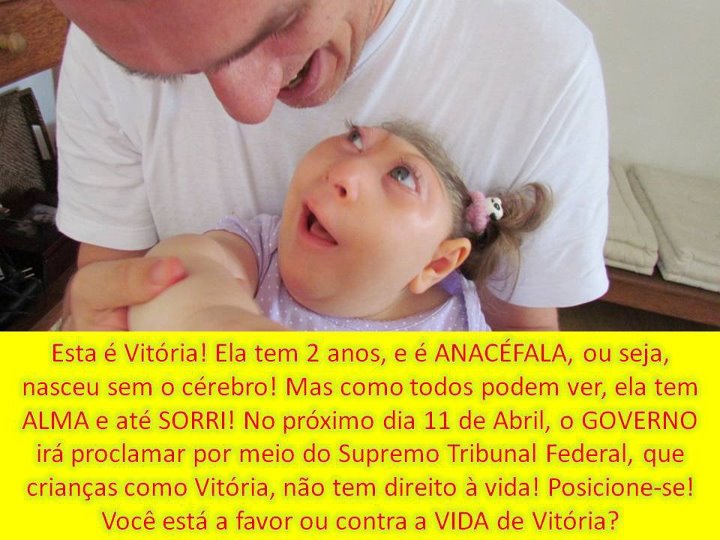 Estou realizando meu trabalho de dissertação sobre ética e politica na internet quando me deparo com algo completamente grotesco. Tem circulado uma foto de uma menina chamada Vitória de 2 anos supostamente anencéfala mas sorridente. Junto a foto segue um texto de apelo religioso e emocional que instiga as pessoas a fazerem uma corrente contra o projeto de lei que permite o aborto para casos de gestação de feto anencefálico. A questão moral é que Vitória não nasceu anencéfala, mas sim ACRANIA!!! Acrania é um problema muito diferente, muito sério e merece respeito, mas não é anencefalia! A criança ACRANIA tem cérebro, mas possui má formação na calota craniana, fato que lhe condenará a uma vida com muitas limitações e dificuldades e provavelmente curta, tal como o caso da vitoriosa Vitória. Por outro lado o feto anencéfalo sofre de uma de patologia letal. Fetos com anencefalia possuem expectativa de vida muito curta, embora não se possa estabelecer com precisão o tempo de vida que terão fora do útero, a maioria morre alguns segundos após o parto, outros vivem um pouco mais, isso porque a anencefalia não é uma má-formação do tipo 'tudo ou nada', ou seja, cada caso é um caso, alguns fetos possuem má formação menor como o caso de bebês com ACRANIA, e outros tem a má formação tão acentuada que nem conseguiríamos identificar como um bebê se olhássemos, esses fetos não possuem nenhuma chance de vida (tudo pode ser diagnosticado) e o prolongamento da gestação só traria dor e sofrimento aos familiares, como no caso do documentário “Uma História Severina” que lhes trago para o debate.