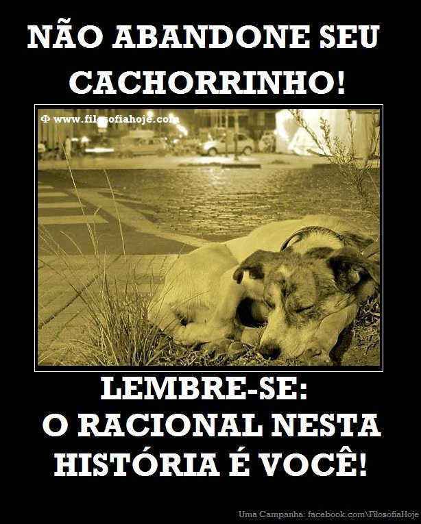 Quando adotar um cachorrinho, deves ter a ciência que aquele pequeno animalzinho será seu total dependente pelo resto de sua vida que pode girar por volta de 20 anos. Isso significa que ele estará contigo não só nos momentos bons e alegres, mas também nas horas difíceis e complicadas. Ele crescerá e além das brincadeiras e das boas rizadas, lhe dará muito gasto com alimentação, higiene e saúde. Ao longo te todos esses anos sua vida e a vida dele mudarão muito, você terá filhos, você mudará de lar, você terá doenças, você vai querer viajar... Ele poderá ter vários filhotes, envelhecerá, pode ser que tenha doenças, pulgas e carrapatos... Vai cuidar de sua casa, mas às vezes fará bagunça, sujeira e pode até ser que machuque alguém num momento de susto. Mas não será culpa dele, afinal O RACIONAL NESTA HISTÓRIA É VOCÊ. Quando atotar um cachorrinho tenha total ciência que tu serás o responsável de tudo que esse pequeno ser causar e necessitar e ELE SÓ SERÁ RESPONSÁVEL POR SER TEU COMPANHEIRO E TE ENCHER DE ALEGRIAS. Por isso: NUNCA ABANDO SEU CACHORRINHO!!! Não gosto muito destas correntes largadas na internet, mas lanço essa campanha não só para denunciar essa realidade imunda, nem para condenar os que isso já fizeram, nem para alertar os querem adotar um cachorrinho... Faço isso, pois acredito que esse é meu dever!!! Se você também acredita, compartilhe! Agradeço pela atenção https://www.facebook.com/FilosofiaHoje