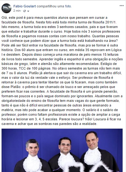 Olá, este post é para meus queridos alunos que pensam em cursar a faculdade de filosofia. Nesta foto está toda minha turma de filosofia 2011/1. Isto mesmo, a turma toda era estes 3 senhores casados, pais e que tiveram que estudar e trabalhar durante o curso. Hoje todos nós 3 somos professores de filosofia e pagamos nossas contas com nosso trabalho. Quantas pessoas você conhece que podem dizer que a turma toda está trabalhando na área? Pode até ser fácil entrar na faculdade de filosofia, mas pra se formar é outra história. Dos 60 aluns que entram no curso, em média 35 reprovam em Lógica I e desistem. Depois disso começa uma maratona de pelo menos 15 leituras de livros todo semestre. Aprender inglês e espanhol é uma obrigação e noções básicas de grego, latim e alemão são altamente recomendadas. Estágio de 300 horas, TCC de 100 páginas. No oitavo semestre as turmas não tem mais de 7 ou 8 alunos. Platão já alertava que sair da caverna era um trabalho difícil, mas o valor da luz da verdade vale o esforço. Ser professor de filosofia é retornar à caverna para tentar libertar os que lá ficaram, mas como também disse Platão: o prêmio é ser chamado de louco e ser ameaçado pelos que preferem ficar nas correntes. A faculdade de filosofia é um grande peneirão, formam-se poucos e o país segue dominado por ignorantes. Atualmente com a obrigatoriedade do ensino de filosofia tem mais vagas do que gente formada, tanto é que não é difícil encontrar pessoas de outras áreas ensinando a matéria, mas isto pode acabar a qualquer momento. O salário é o salário de professor, porém como faltam profissionais existe a opção de ampliar a carga horária e lecionar em 3, 4, 5 escolas. Parece loucura? Não! Loucura é ficar na caverna e achar que as sombras nas paredes são a realidade.