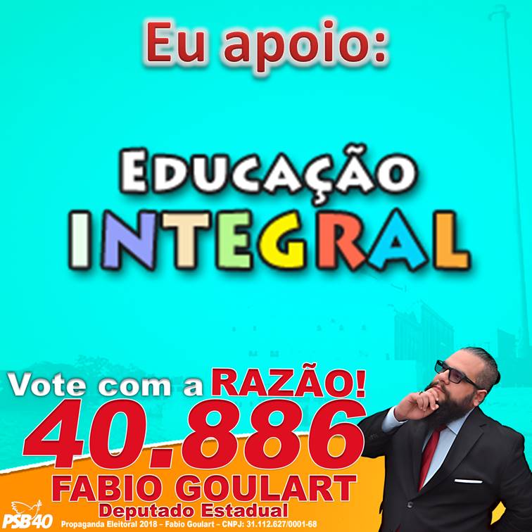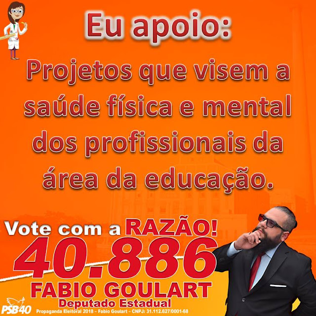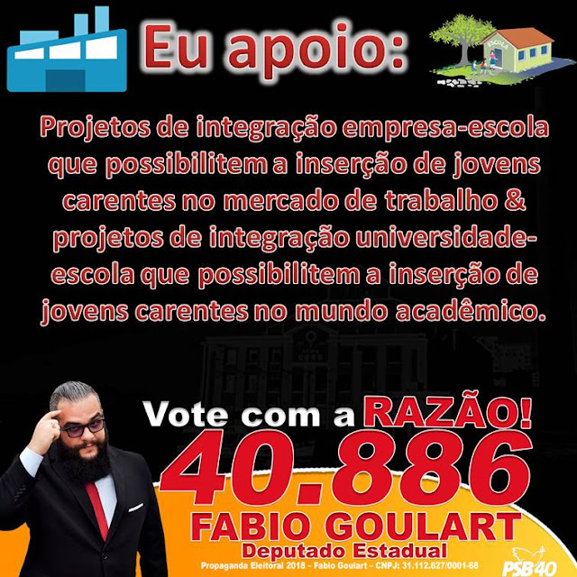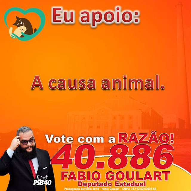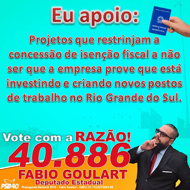 Se você também apoia compartilhe e curta. Iniciamos agora as últimas 24 horas da campanha #VoteComRazão #FabioGoulart40886 que está mudando o jeito de se fazer campanha e mudará a política. Serão 24 postagens diferentes, uma por hora, escolha sua favorita e COMPARTILHE! Assim vamos vencer essa eleição, tirar uma raposa velha do poder e colocar o filósofo Fabio Goulart para mudar o Rio Grande :) Nesta eleição #VoteComRazão #FabioGoulart40886 #DeputadoEstadual #RS #fichalimpa #Eleição2018 Leia minhas propostas neste link: http://www.filosofiahoje.com/2018/08/propostas-de-fabio-goulart-para.html :) #Tamojunto até a vitória :) Propaganda Eleitoral CNPJ 31.112.627/0001-68