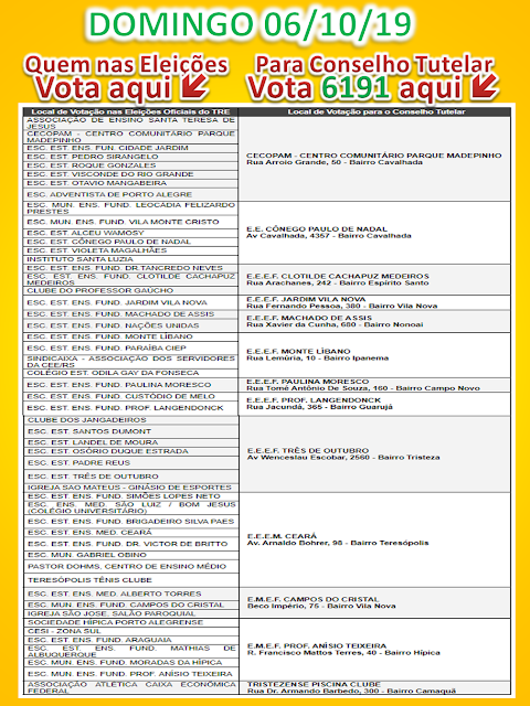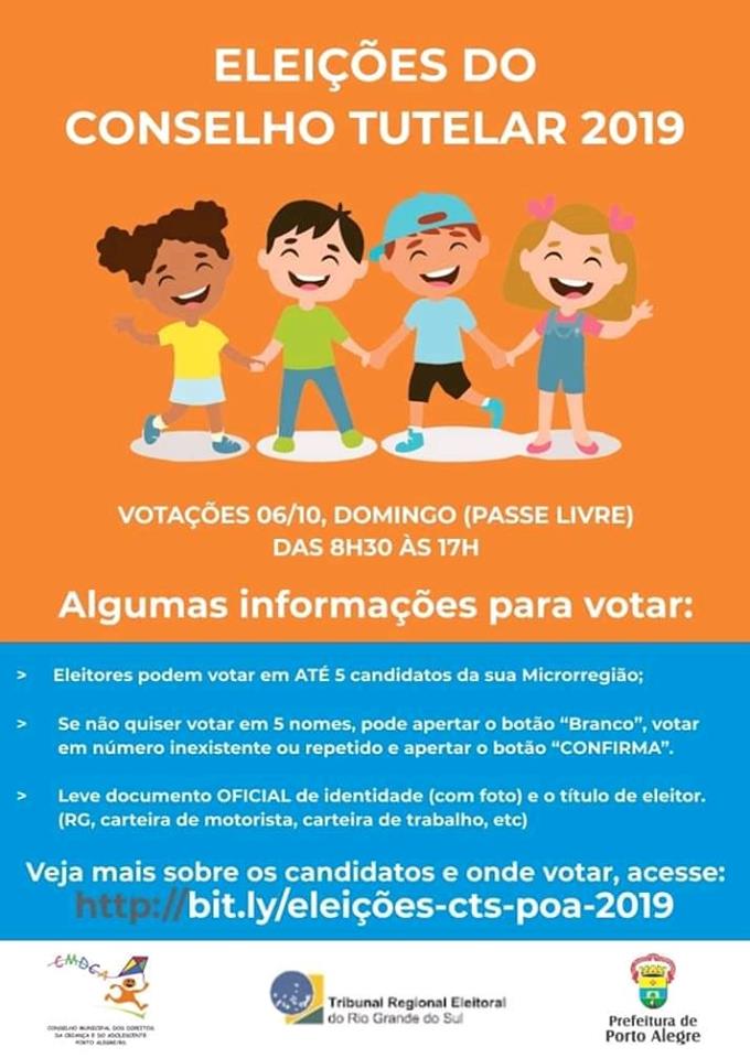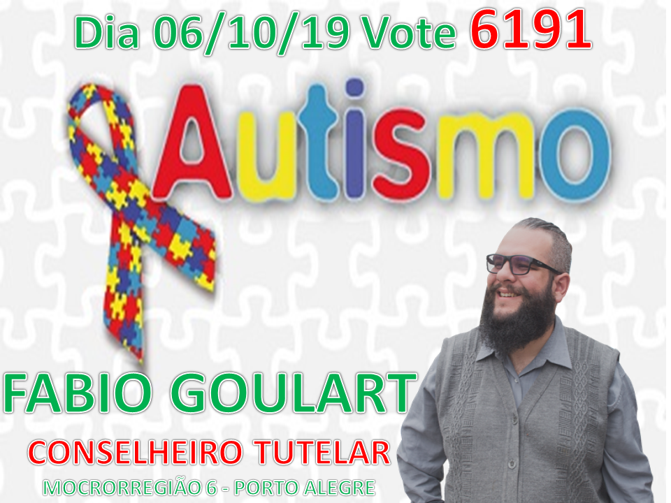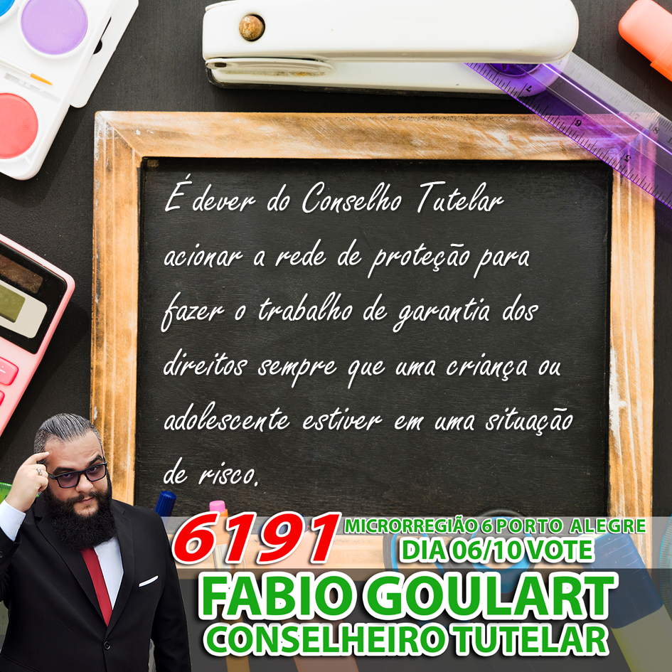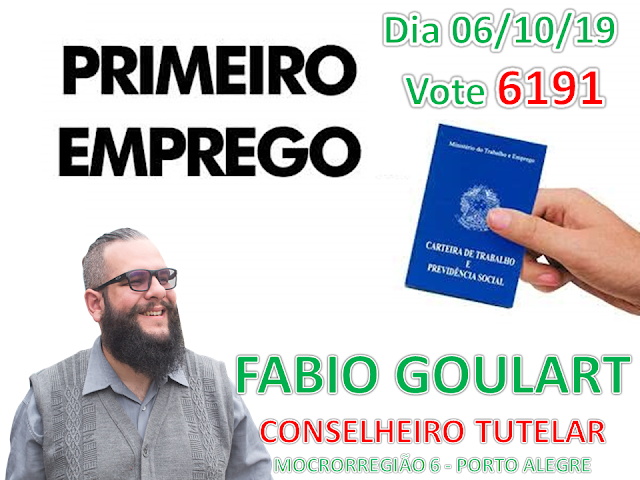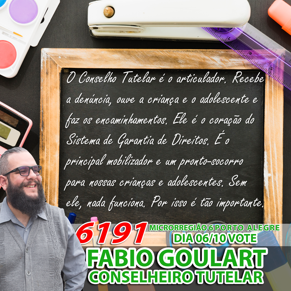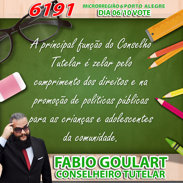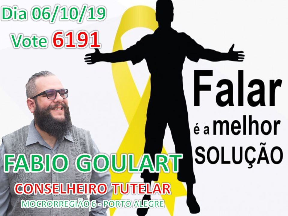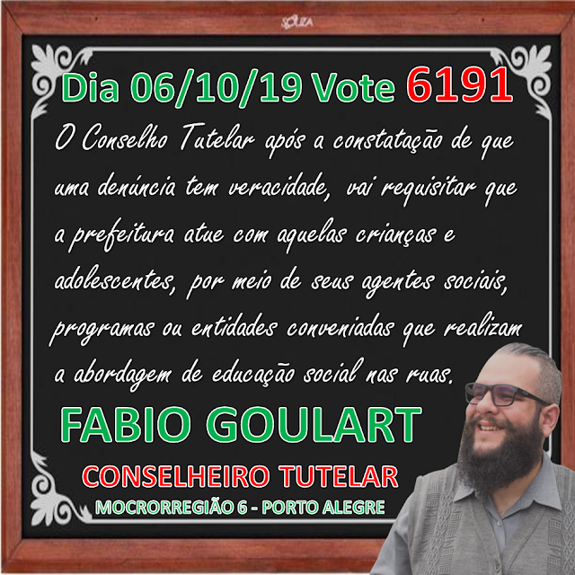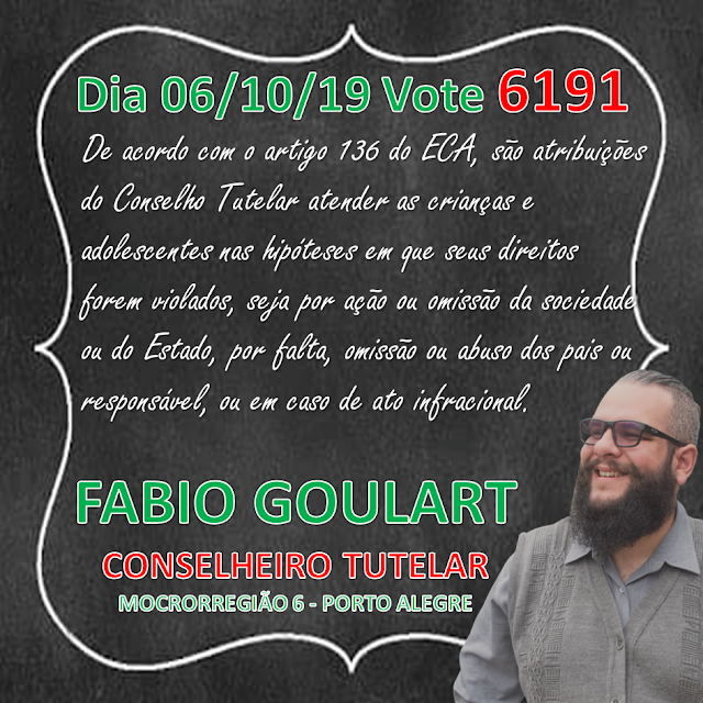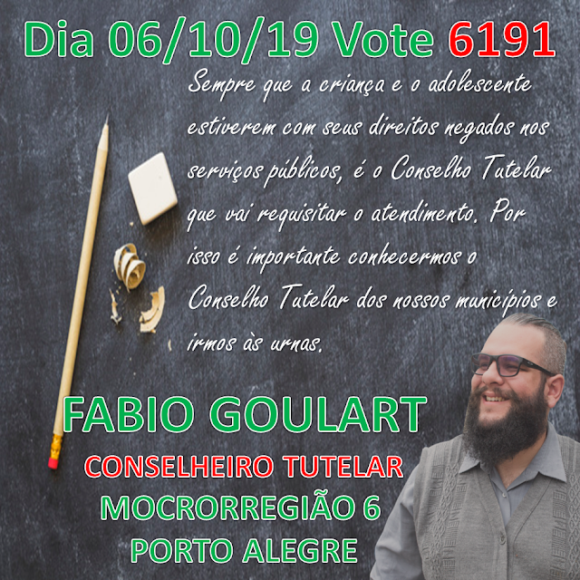 Já é neste domingo dia 06/10 a eleição para conselho tutelar. É muito importante que tu votes e mobilize tua família e amigos, pois esta é uma função que luta pela conquista e manutenção dos direitos das crianças e adolescentes que são o futuro de nosso país. Eu sou o professor e filósofo Fabio Goulart, meu número é 6191, estou concorrendo pela microrregião 6 de Porto Alegre (dos bairros Tristeza até Moradas da Hípica). Para saber mais informações como locais de votação clique no link do site criado pela própria prefeitura para ajudar os eleitores http://bit.ly/ eleições-cts-poa-2019