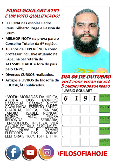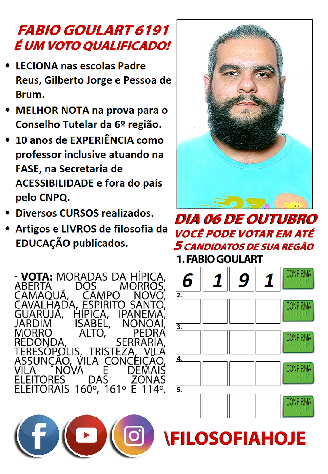 Domingo dia 06/10/19 ocorre a eleição para Conselho Tutelar em todas as cidades do Brasil. O voto é facultativo, por isso mesmo é importante que você que tem consciência política pegue seu título e documento de identidade e domingo dia 06/10/19 vá votar. Dá pra escolher até 5 candidatos. Escolha os melhores para qualificar o cada vez mais necessário atendimento às nossas crianças e adolescentes. Se você é da zona sul de Porto Alegra saiba que eu, (O professor e filósofo Fabio Goulart da Página www.FilosofiaHoje.com ) sou candidato e meu numero é 6191! Tenho 10 anos de experiência como professor estadual de Ensino Médio. 4 anos de experiência como professor municipal de Ensino Fundamental. Experiência internacional em estágio pelo CNPQ. MELHOR NOTA da 6º microrregião de Porto Alegre na prova de 2019 para Conselheiro Tutelar. Diversos cursos realizados sobre direito e proteção a crianças e adolescentes. Experiência como professor na FASE (antiga FEBEM). Experiência na Secretaria de Acessibilidade e Inclusão de Porto Alegre. Diversos artigos e livros de filosofia da educação publicados. Conhece bem a realidade das crianças e adolescentes da região, lecionando nas escolas Padre Reus, Gilberto Jorge e Pessoa de Brum, além de manter constante contato com Anísio Teixeira e Moradas da Hípica. Dia 06/10/2019 votar professor FABIO GOULART 6191 é votar em alguém extremamente qualificado e preparado para garantir a proteção e os direitos das crianças e adolescentes da microrregião 6 de Porto Alegre! Curta, compartilhe e marque os amigos e vizinhos nesta postagem, se cada um conseguir mais 5 ou 10 votos é certo que vamos sair vitoriosos e poderei realizar um serviço qualificado em defesa das Crianças e Adolescentes de minha região. Se você não é desta região Peço que também curta, compartilhe e indique os amigos. Caso já tenha outro candidato, não tem problema, pois tu podes votar em até 5 conselheiros, vote 6191 FABIO GOULART e também nos seus favoritos.