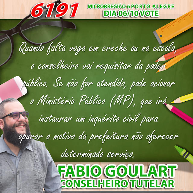 Quando falta vaga em creche ou na escola, o conselheiro vai requisitar do poder público. Se não for atendido, pode acionar o Ministério Público (MP), que irá instaurar um inquérito civil para apurar o motivo da prefeitura não oferecer determinado serviço. Eu sou o professor e filósofo Fabio Goulart, meu número é 6191, estou concorrendo pela microrregião 6 de Porto Alegre (dos bairros Tristeza até Moradas da Hípica). Tenho mais de 10 anos de experiência, bacharelado, licenciatura, mestrado, diversos cursos, livros e artigos publicados. Leve título de eleitor e documento de identidade com foto para votar! É muito importante que tu votes e mobilize tua família e amigos, pois esta é uma função que luta pela conquista e manutenção dos direitos das crianças e adolescentes que são o futuro de nosso país. Uma das dúvidas mais comuns é sobre local de votação da microrregião, para essa e outras informações clique no link do site criado pela própria prefeitura para ajudar os eleitores http://bit.ly/eleições-cts-poa-2019