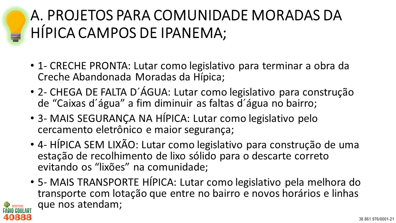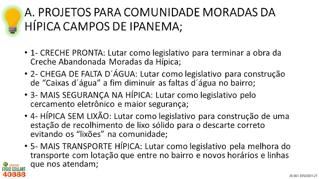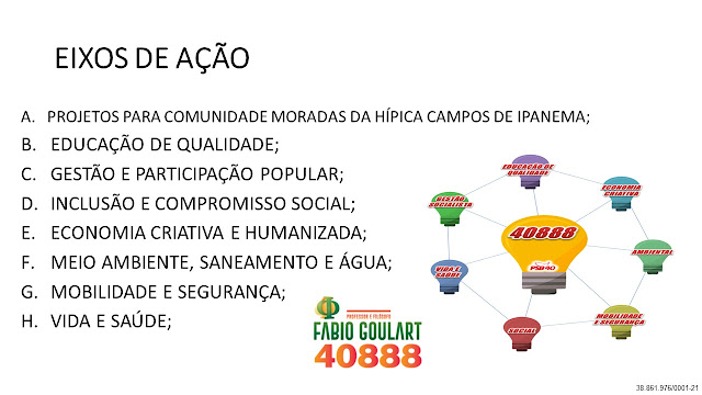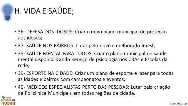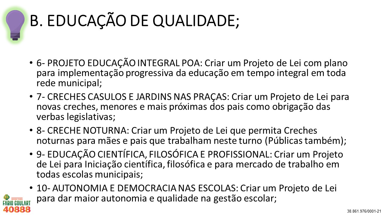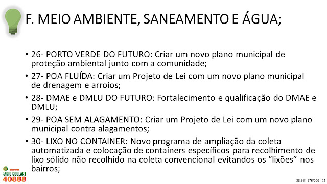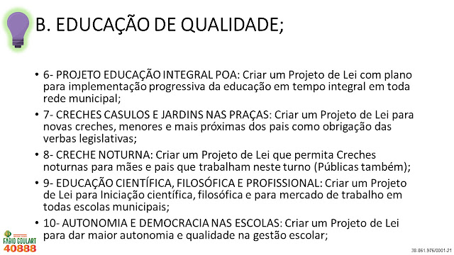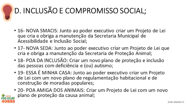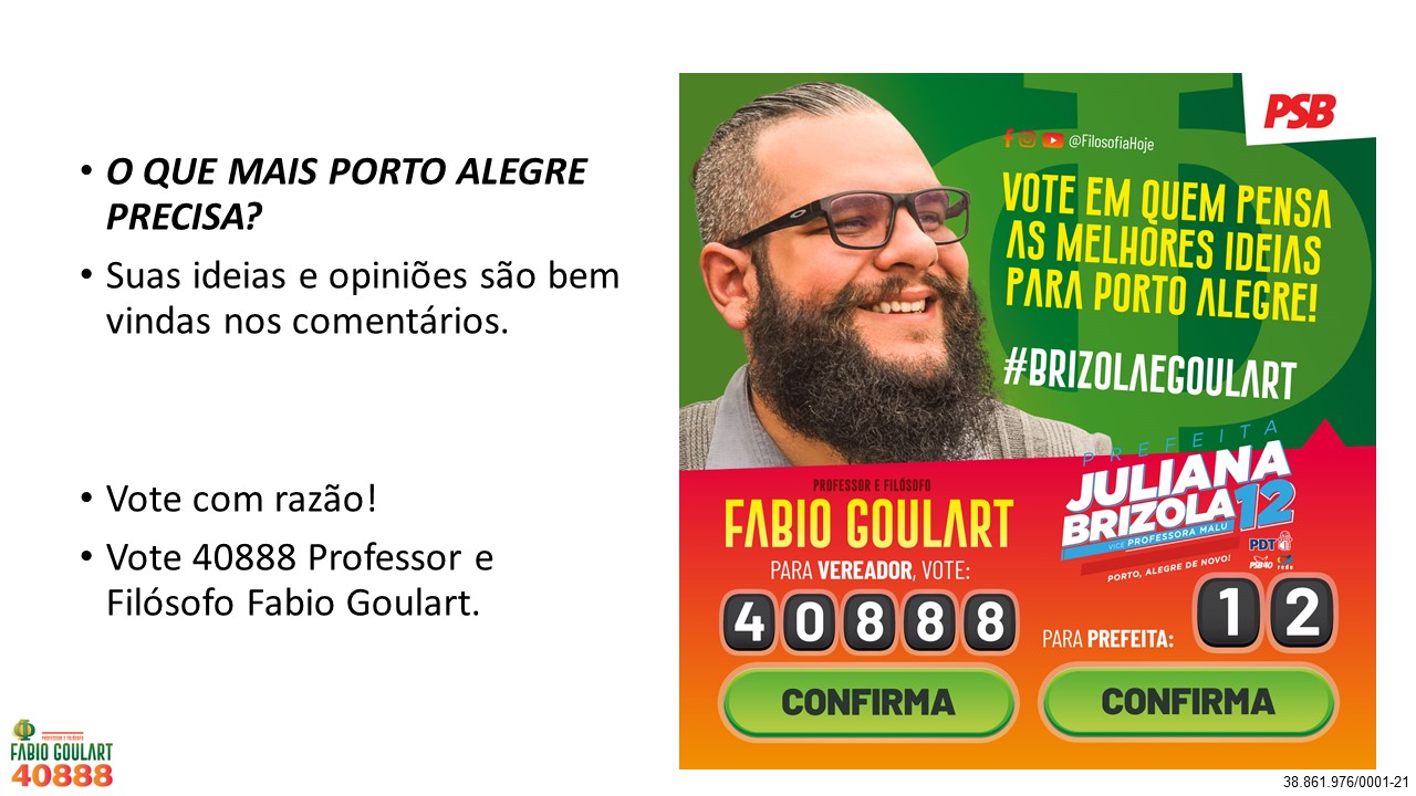 Diferentemente de outros políticos que não tem ideias para cidade e que só pensam nos próprios interesses, eu como professor e filósofo lhes apresento não uma ou duas, mas sim 40 ideias para Porto Alegre. Lembrando que são funções do vereador Legislar, Fiscalizar, Sugerir e Representar vocês, ou seja, Lutar por vocês! É justamente isso que vou fazer e conto o voto de todos. Vote 40888 e peça para a família, colegas, amigos e vizinhos votarem também!