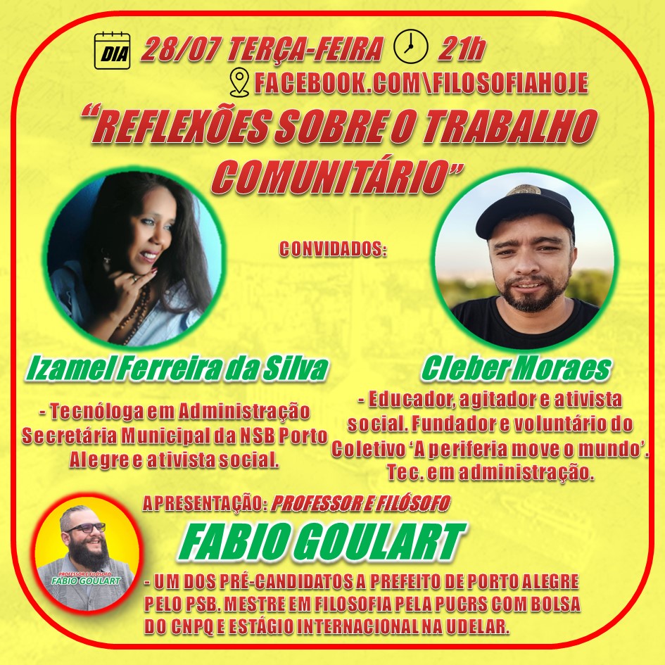 A página FilosofiaHoje.com recebe Izamel Ferreira da Silva (Secretária Municipal da NSB Porto Alegre e ativista social) e Cleber Moraes (Educador, agitador e ativista social. Fundador e voluntário do Coletivo ‘A periferia move o mundo’) para um papo e REFLEXÕES SOBRE O TRABALHO COMUNITÁRIO com o professor e filósofo Fabio Goulart. É hoje às 20h! Clique no link, marque o lembrete e convide os amigos. https://www.facebook.com/FilosofiaHoje/videos/291837452050254/