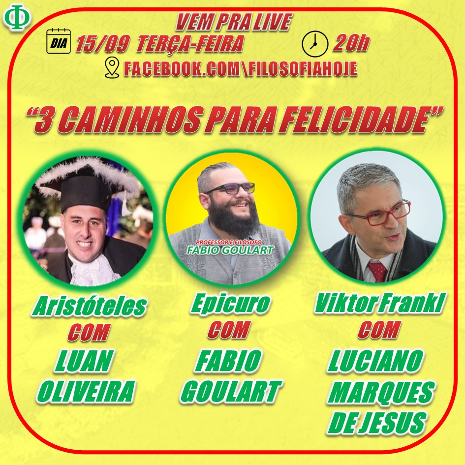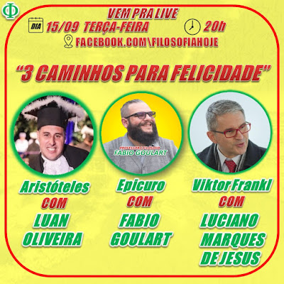 Quem quer ser feliz? Quem não quer ser feliz? Que tal 3 Caminhos para a Felicidade? Aristóteles, Epicuro e Viktor Frankl com os filósofos Fabio Goulart, Luciano Marques de Jesus e Luan Oliveira. Nesta terça-feira dia 15/09 às 20h no facebook da página Filosofia Hoje. Clique no link, marque o lembrete e compartilhe para os amigos https://www.facebook.com/FilosofiaHoje/posts/3401880009835052 Siga @filosofiahoje em todas rede