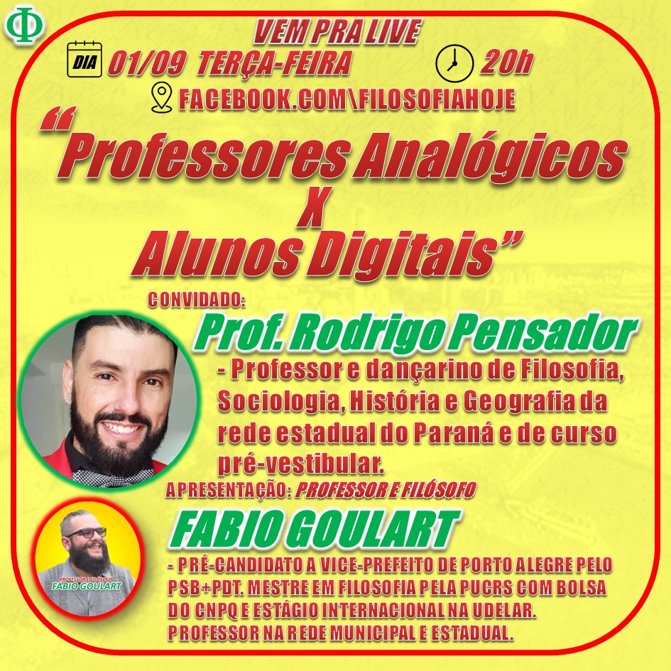 Terça-feira, 01/09 às 20h, a página FilosofiaHoje.com recebe o Professor e dançarino de Filosofia, Sociologia, História e Geografia da rede estadual do Paraná e de curso pré-vestibular Rodrigo Pensador. Dançarino? Sim! Rodrigo Pensador ficou reconhecido por trazer muitas inovações nas suas aulas, inclusive dança hahaha. Professores Analógicos X Alunos Digitais. Marque o lembrete e convide os amigos. Apresentação do Professor e filósofo Fabio Goulart. Link para assistir: https://www.facebook.com/FilosofiaHoje/videos/3026029154300445/