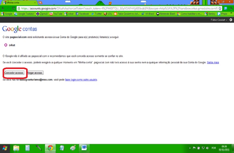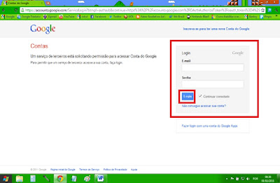 3° TELA DE LOGIN: Aqui você vai fazer o login na rede social escolhida... claro que se você já estiver logado essa tela não aparecerá. (a tela é diferente de acordo com a rede escolhida, o exemplo abaixo se refere ao Orkut).