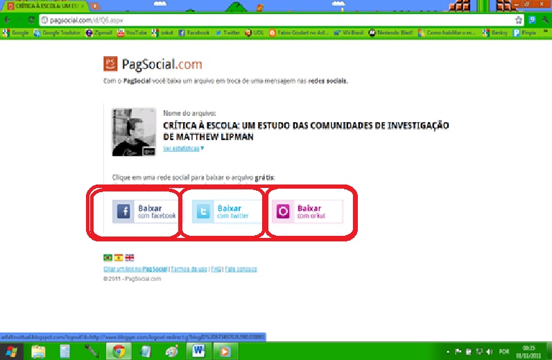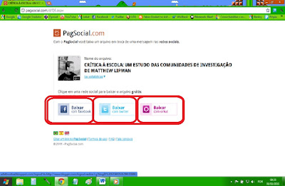 2° ESCOLHA SUA REDE SOCIAL FAVORITA: Nesta tela vai aparecer minha foto, o nome do arquivo a ser baixado e o link para baixar via Facebook, Twitter ou Orkut... Escolha sua rede social favorita e clique em seu respectivo ícone.